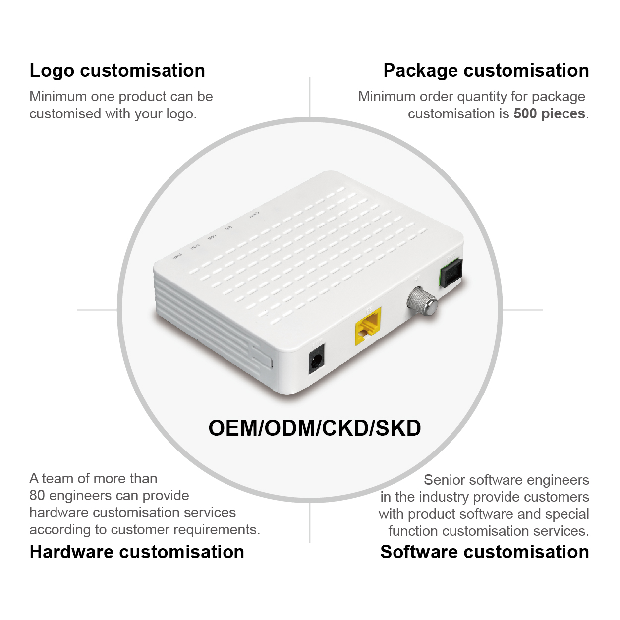 G53C is a residential gateway device with SFU functions for xPON ONU and SOHO users, which is in line with ITU-T G.984 and IEEE802.3ah.